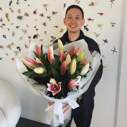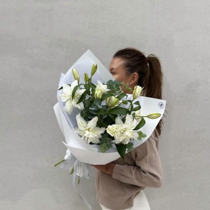 Букет из лилий, гортензии, эустомы, роз, гвоздики и гипсофилы в корзине “Карндона”
