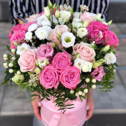 Цветы в коробке «Рассвет»( Роза Ароматная premium О Хара, Альстромерия )