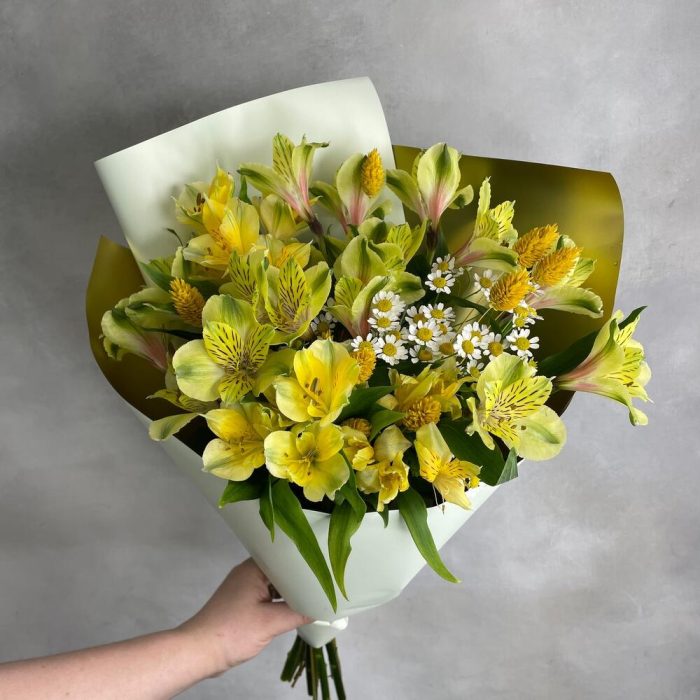 Альстромерия – 7 шт.Матрикария – 2 шт.Фаларис – 10 шт.Упаковка дизайнерская – 1 шт.
