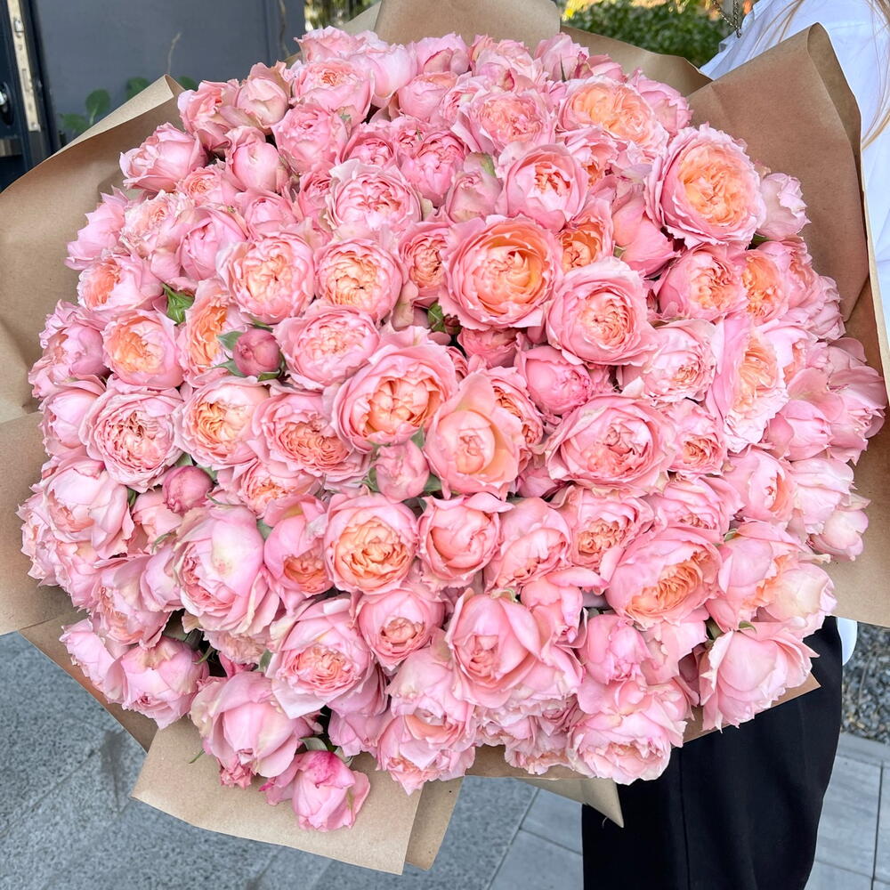 Піоновидна кущова троянда сорту Juliet в крафтовому пакуванні