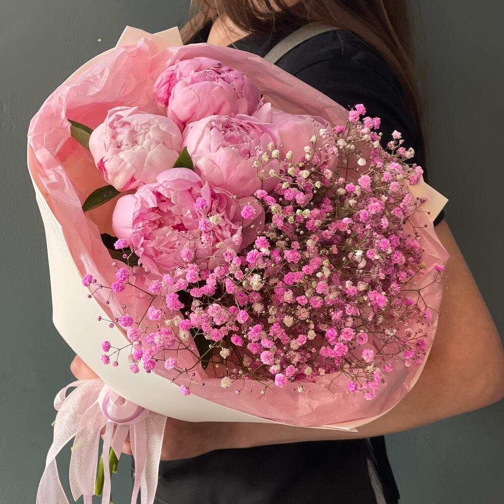 Гипсофила – 2 шт.Лента – 1 шт.Пион – 5 шт.Упаковка – 1 шт.