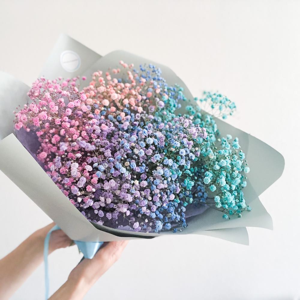 Гипсофила – 7 шт.Упаковка корейская – 2 шт.Лента атласная – 1 шт.