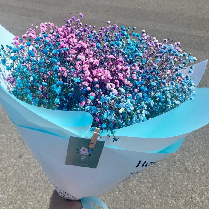 Лента атласная – 1 шт.Упаковка дизайнерская – 7 шт.Гипсофила крашеная – 7 шт.