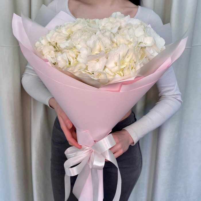 Гортензия – 3 шт.Лента атласная – 2 шт.Пленка дизайнерская – 3 шт.открытка с вашими пожеланиями – 1 шт.