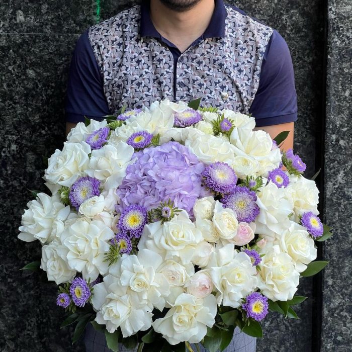 Гортензия сиреневая – 1 шт. Астра кустовая – 9 шт. розы – 21 шт. розы кустовые пионовидные – 7 шт. Рускус – 25 шт. Аспидистра – 6 шт.