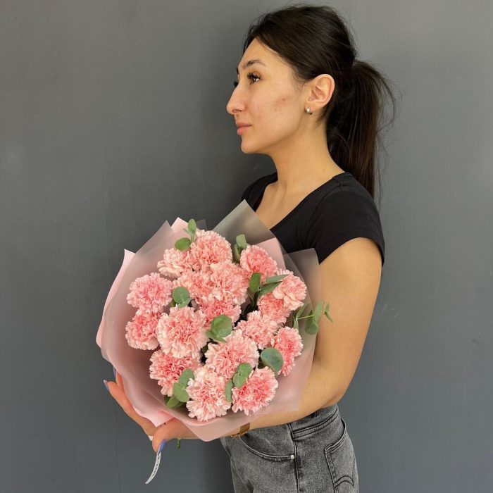 17 нежно-розовых диантусов с эвкалиптом