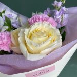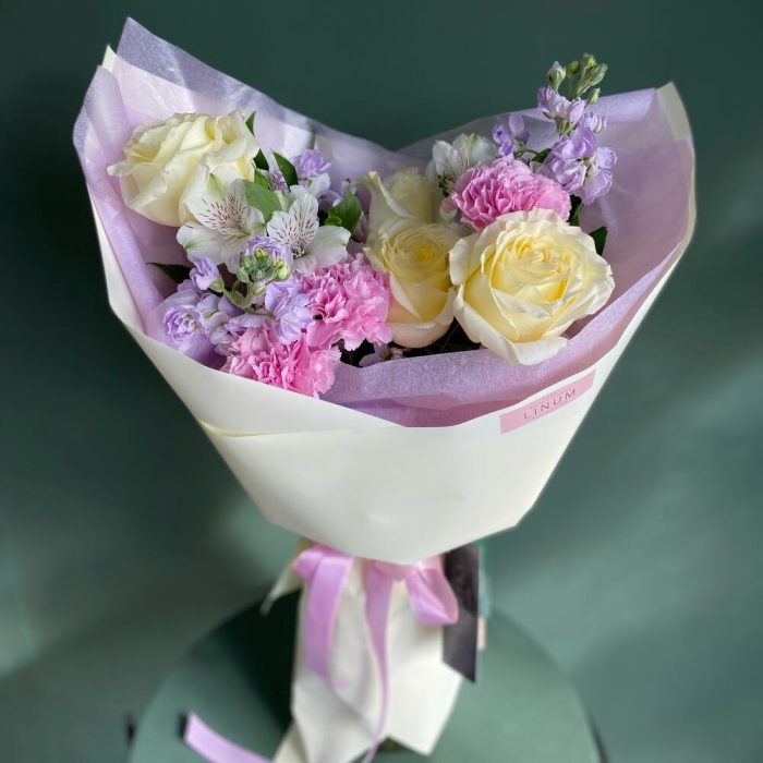 роза кендилайт – 4 шт.Маттиола – 4 шт.Гвоздика – 3 шт.Альстромерия – 2 шт.Упаковка дизайнерская – 1 шт.Открыточка с вашими пожеланиями – 1 шт.транспортировочная упаковка – 1 шт.уходовое средство для цветов – 1 шт.