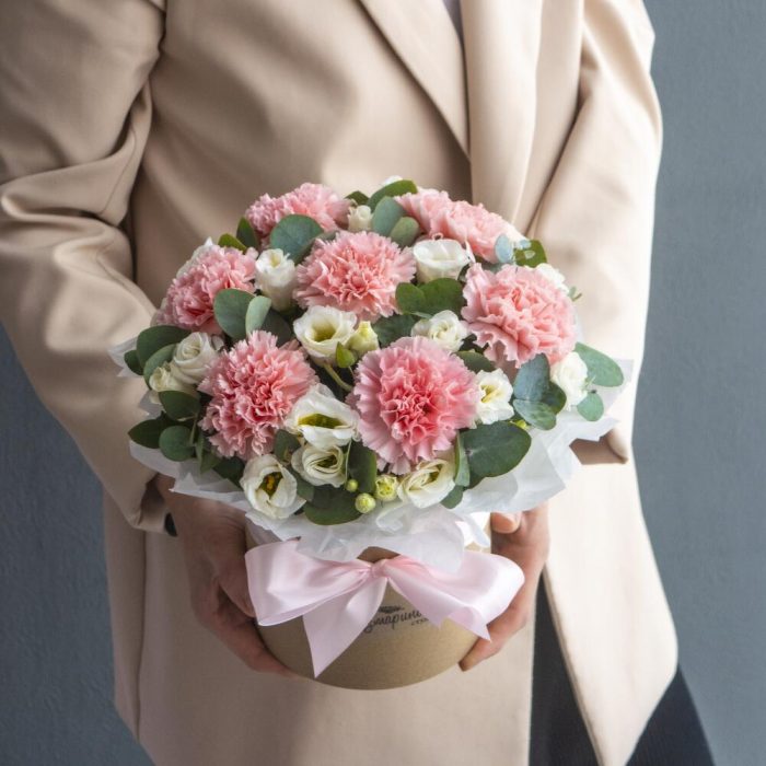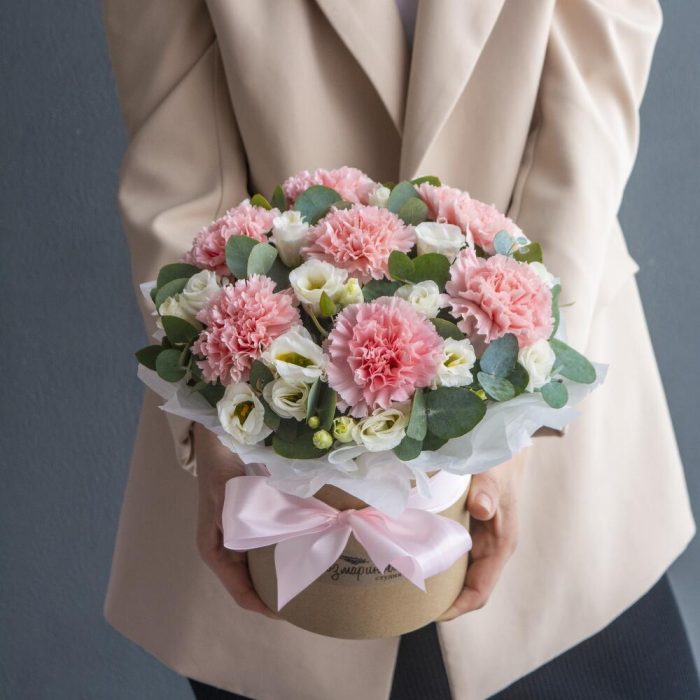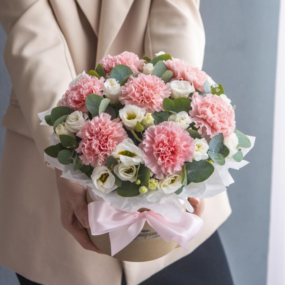 Эвкалипт – 8 шт.Гвоздика розовая – 7 шт.Коробка шляпная – 1 шт.Оазис кирпич – 1 шт.эустома белая – 2 шт.