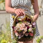 Роза кустовая пионовидная – 3 шт.Альстромерия – 2 шт.Роза – 3 шт.Лизиантус – 3 шт.Диантус – 7 шт.Астранция – 2 шт.Клематис – 1 шт.цветы микс – 5 шт.зелень декоративная – 5 шт.Эвкалипт – 1 шт.