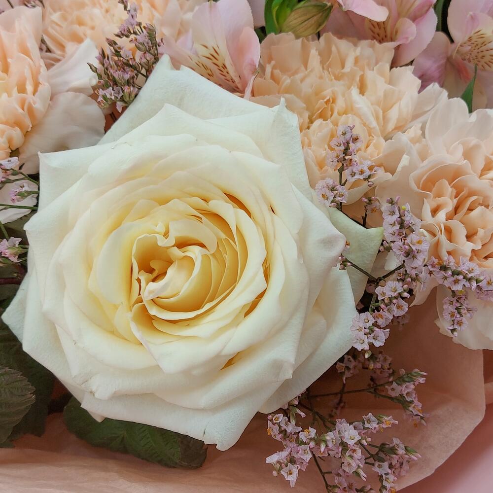 Лимониум – 2 шт.Зелень – 4 шт.Упаковка дизайнерская – 1 шт.альстромерия премиум – 2 шт.гвоздика сортовая (диантус) – 4 шт.роза пионовидная кэндллайт – 1 шт.