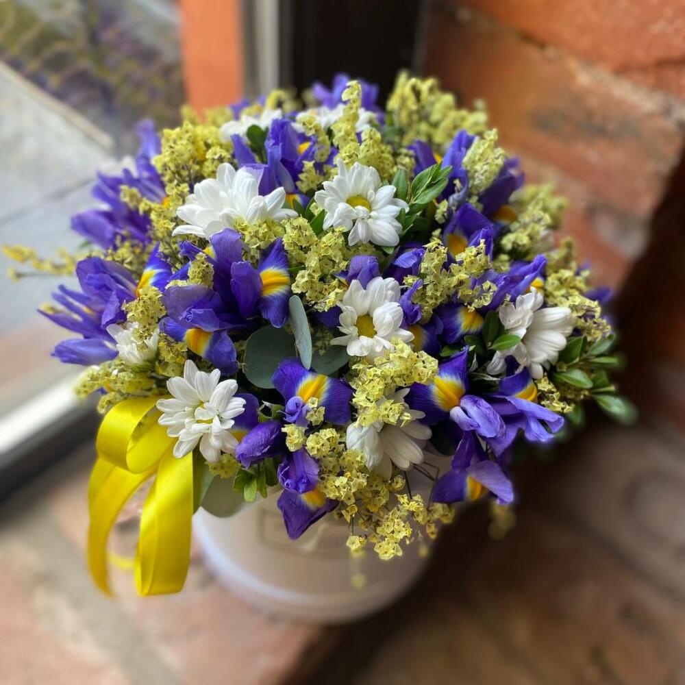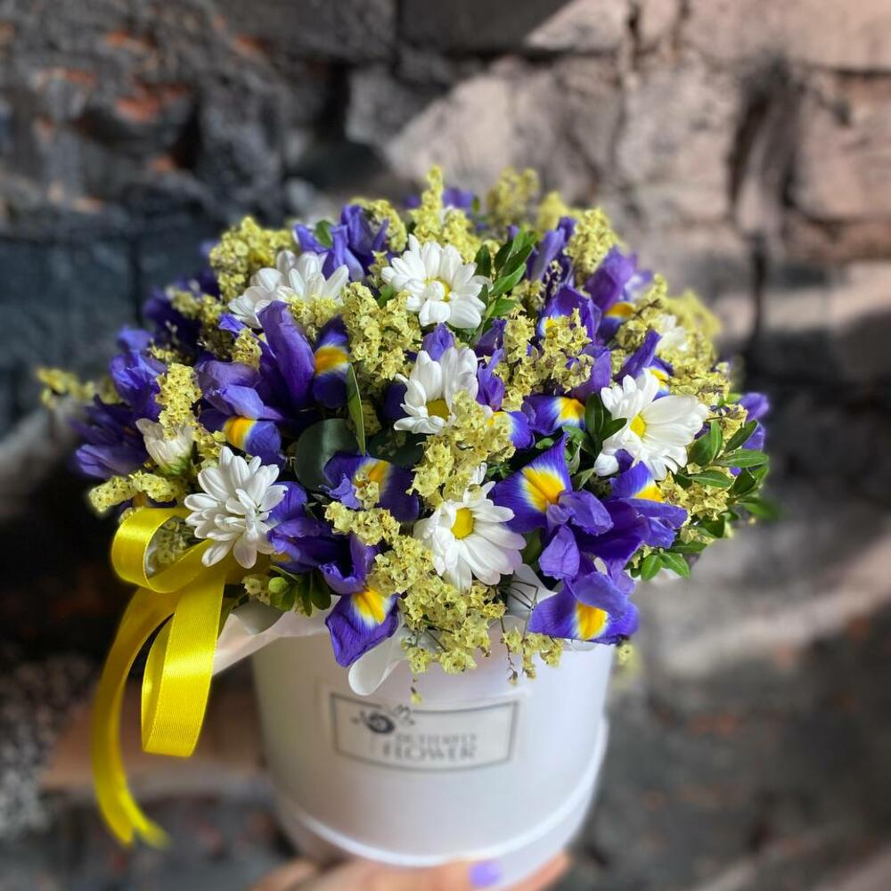 Шляпная коробка – 1 шт.Оазис – 1 шт.Лимониум – 3 шт.Ирис – 15 шт.Хризантема кустовая – 2 шт.Самшит – 2 шт.Лента – 2 шт.