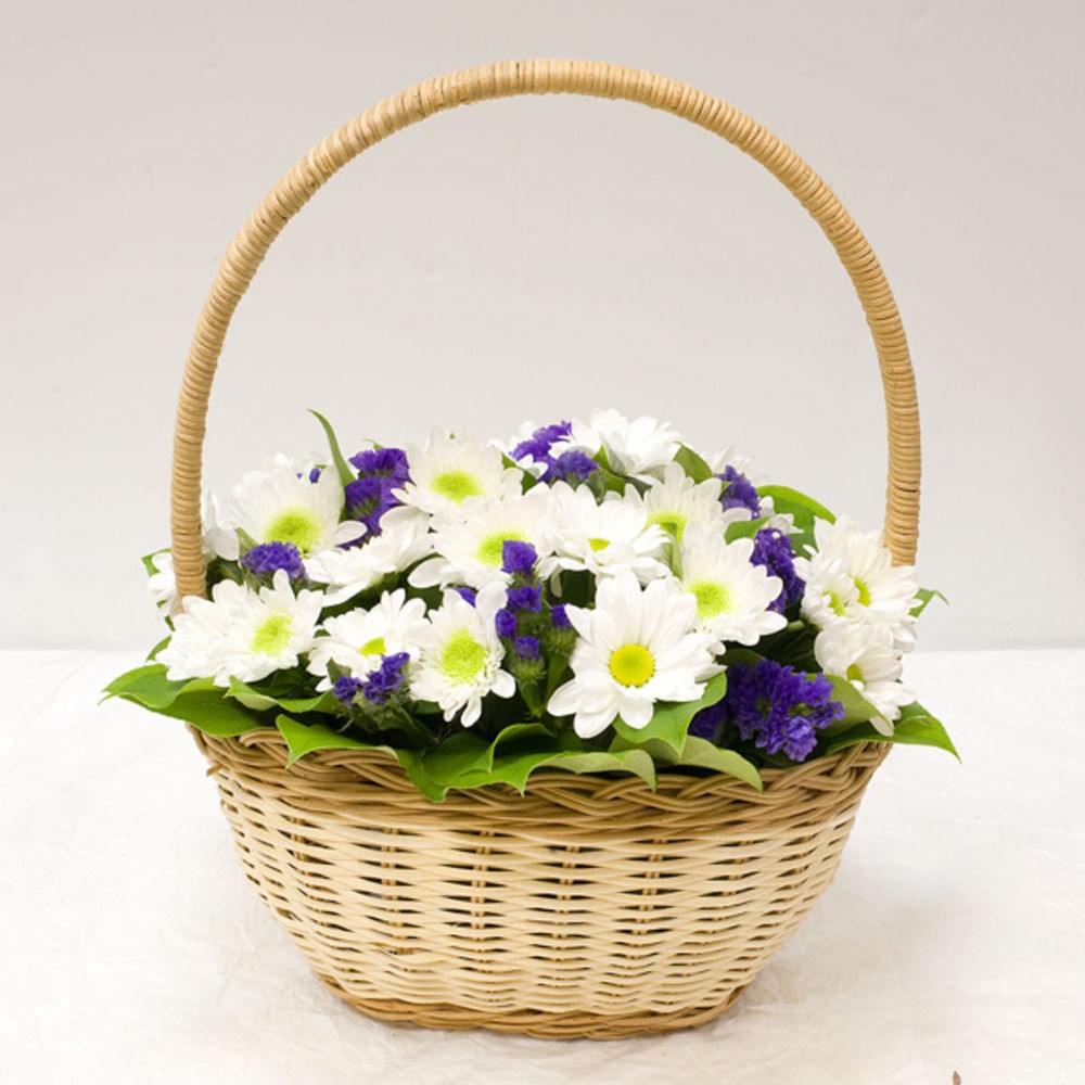 Хризантема кустовая – 3 шт.Статица – 2 шт.Зелень – 1 шт.Оазис – 1 шт.Корзина – 1 шт.