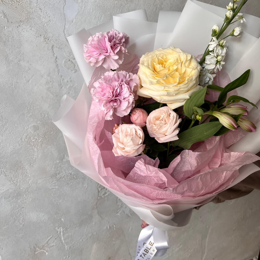 Нежный букет комплимент с маттиолой и пионовидной розой