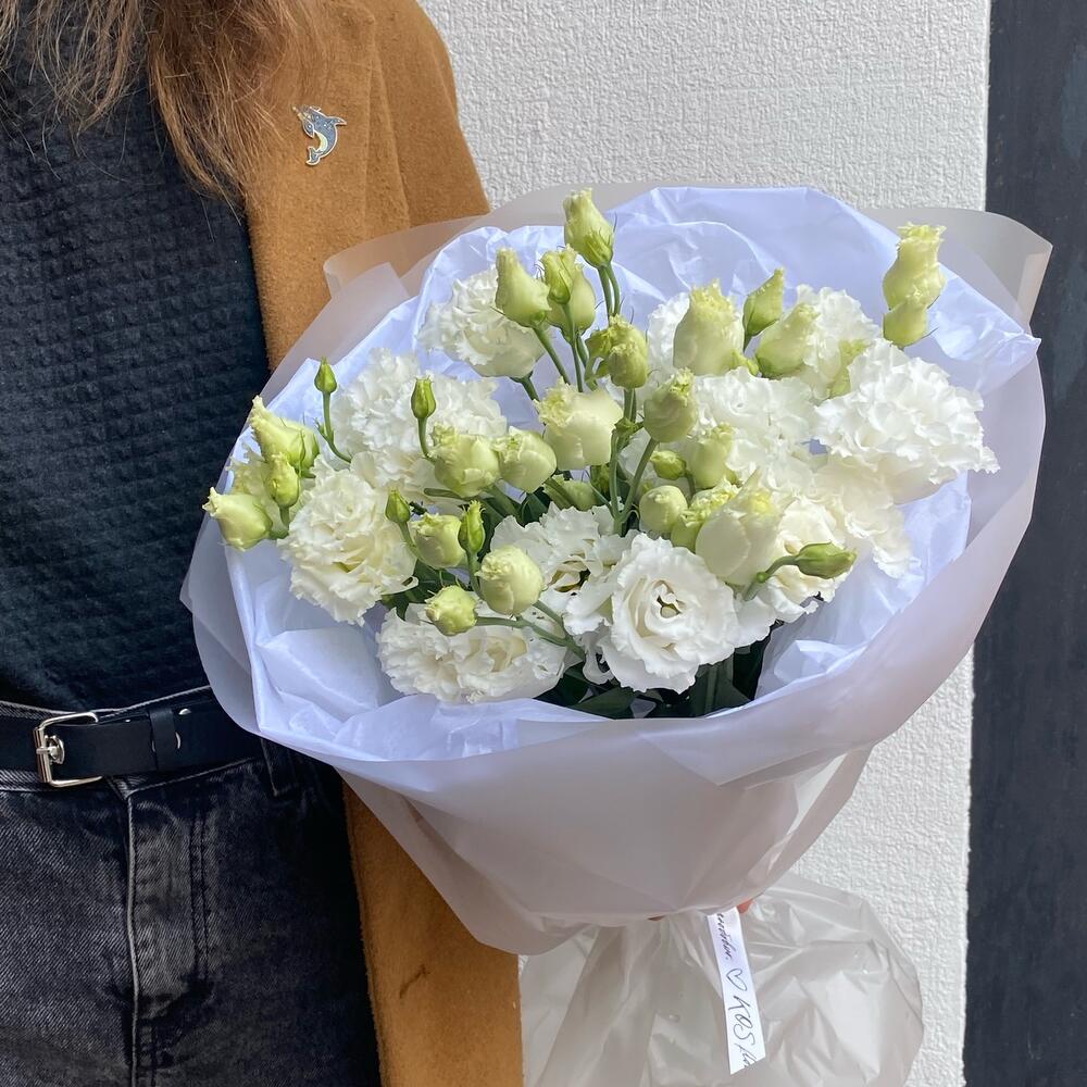 лизиантус махровый белый – 7 шт.Тишью – 2 шт.Упаковка дизайнерская – 4 шт.лента атласная брендированная – 1 шт.