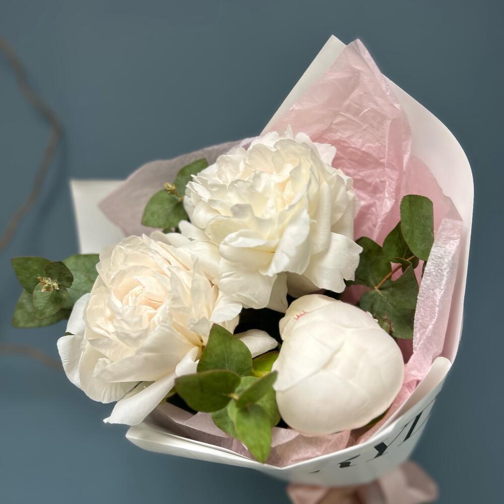 Эвкалипт – 1 шт.Тишью – 1 шт.Упаковка дизайнерская – 1 шт.пион mother’s choices – 3 шт.