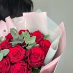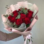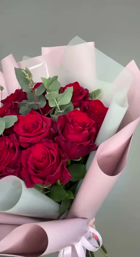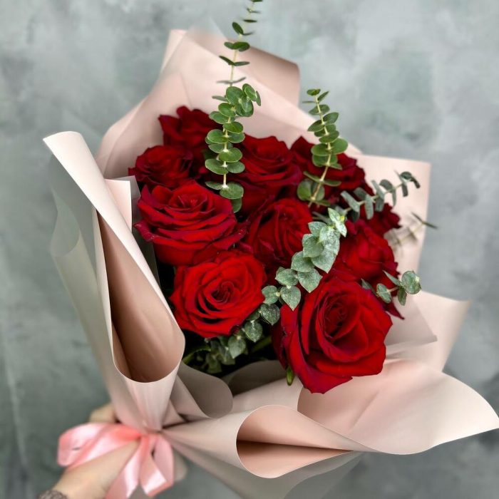 Букет из 9 красных роз с эвкалиптом