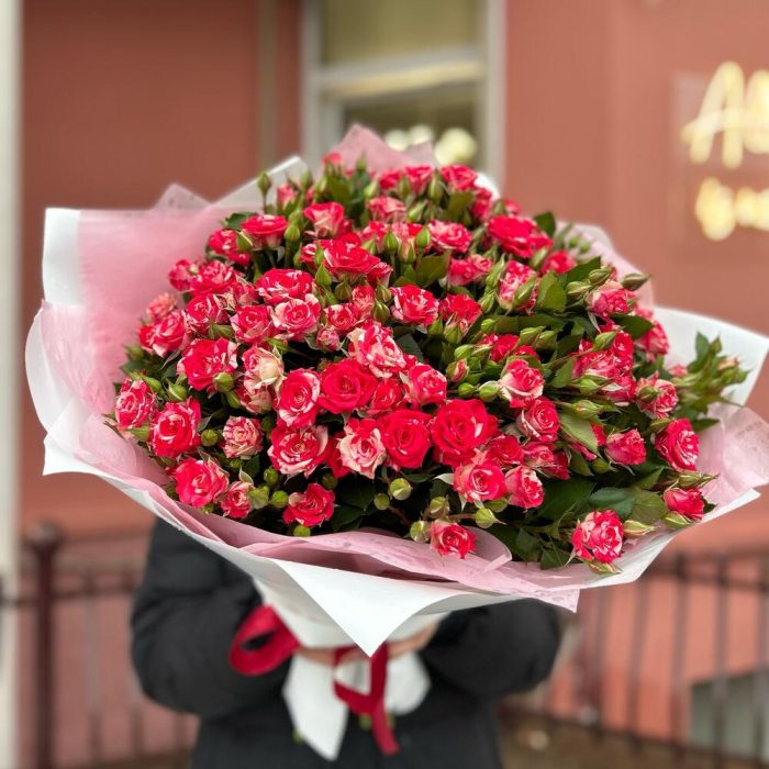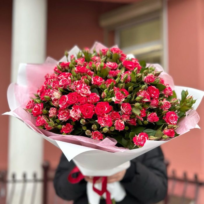 Кустовая роза – 15 шт. Матовая пленка – 1 шт. Тишью – 1 шт.