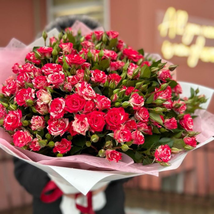 Букет из 15 веток кустовых роз сорта фаерворкс с оформлением, количество бутонов(розочек) в букете может достигать 101 штуки .