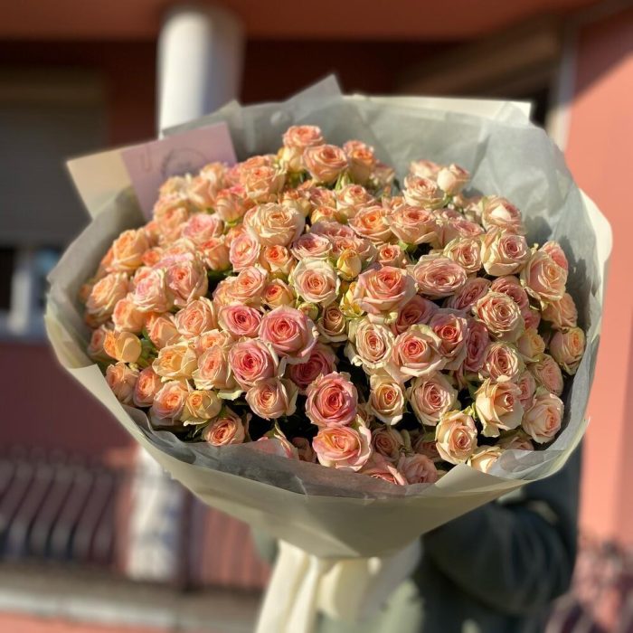 Кустовая роза – 25 шт. Тишью – 1 шт. Дизайнерская упаковка – 1 шт.