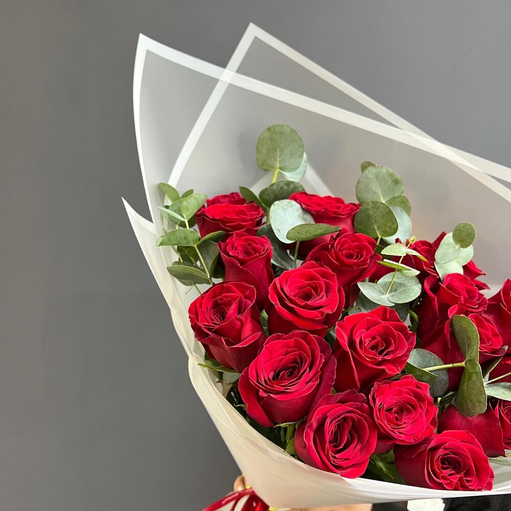21 красная роза с эвкалиптом