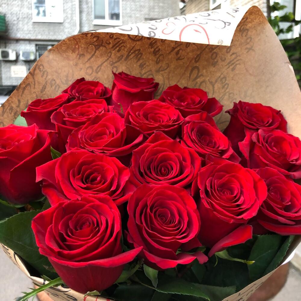 21 роза 60 сантиметров – 21 шт.Крафт упаковка – 1 шт.Лента атласная – 1 шт.
