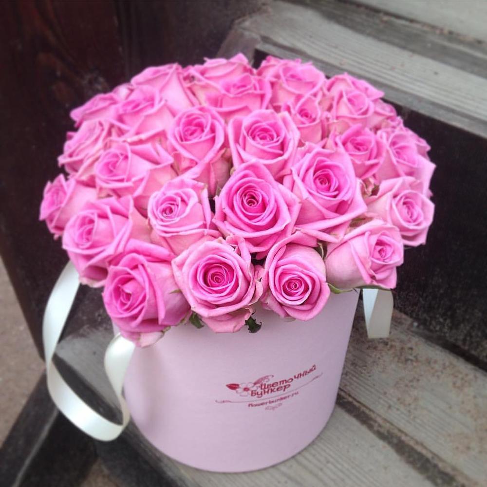 Роза розовая – 25 шт.шляпная коробка 18*18 см – 1 шт.Аквабокс – 1 шт.полисилк – 1 шт.