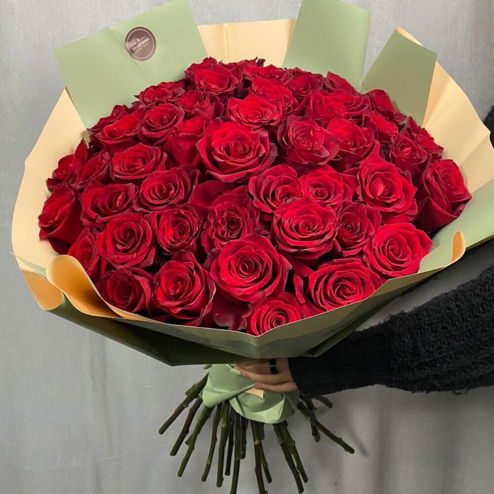 розы эквадор (60 см) – 51 шт.Крафт – 2 шт.Лента атласная – 1 шт.