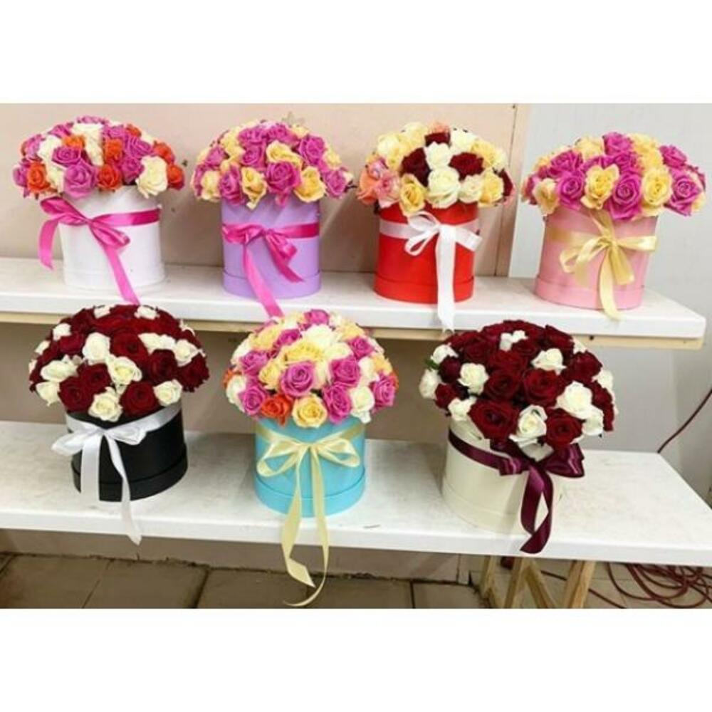 розы – 51 шт.Шляпная коробка – 1 шт.Оазис – 1 шт.Зелень – 3 шт.доставка – 2 шт.