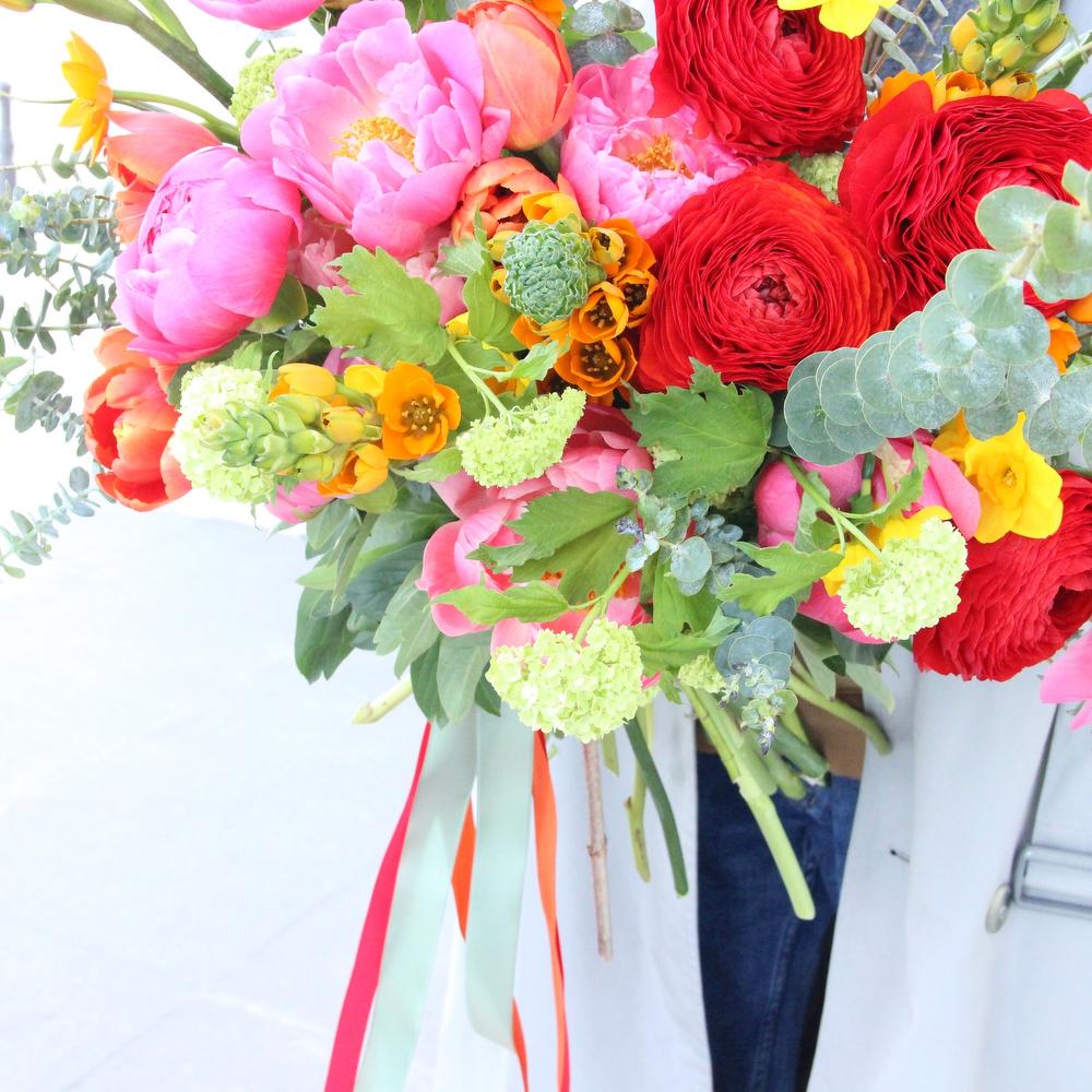 Пион коралл шарм – 5 шт.Орнитогалум – 3 шт.Нарцисс – 5 шт.Тюльпан – 6 шт.Вибурнум – 4 шт.Роза пионовидная – 3 шт.