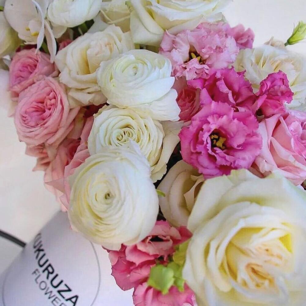 орхидея – 2 шт.Ранункулюс ханой – 10 шт.Антуриум – 2 шт.пионовидная роза white o’hara – 25 шт.пионовидная роза pink o’hara – 25 шт.пионовидная роза плайя бланка – 25 шт.Эустома – 10 шт.Кустовая пионовидная роза Бомбастик – 10 шт.