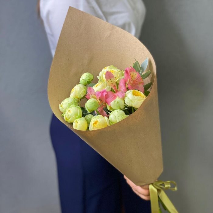 Роза пионовидная желтая – 5 шт. Альстромерия – 1 шт. Крафт – 1 шт. Открыточка с вашими пожеланиями – 1 шт. доставка – 1 шт.