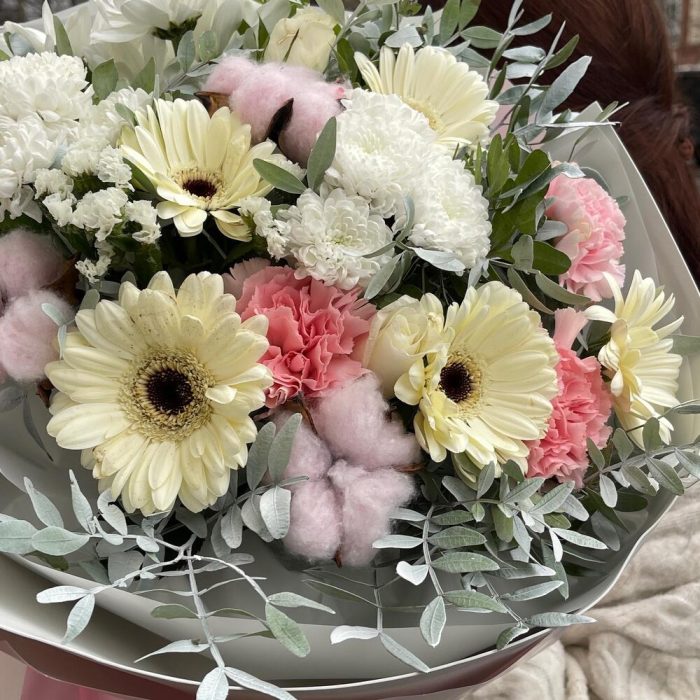 Гербера мини – 5 шт.Гвоздика – 3 шт.Хризантема кустовая – 1 шт.сантинии белые – 2 шт.Роза – 2 шт.Хлопок натуральный – 3 шт.Фисташка пучок – 1 шт.Пленка матовая – 4 шт.Лента атласная – 2 шт.фаомиран – 1 шт.