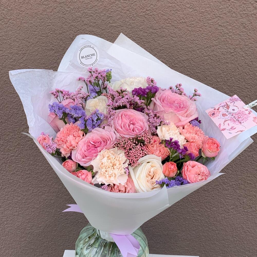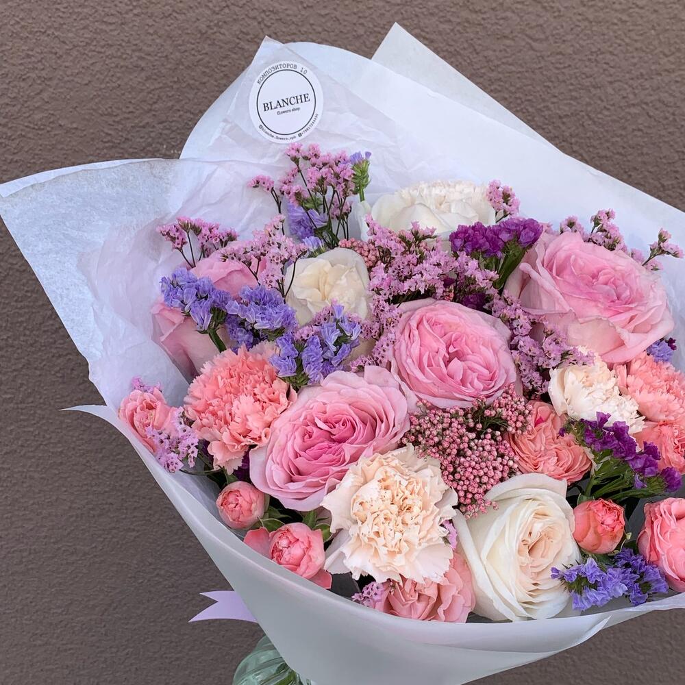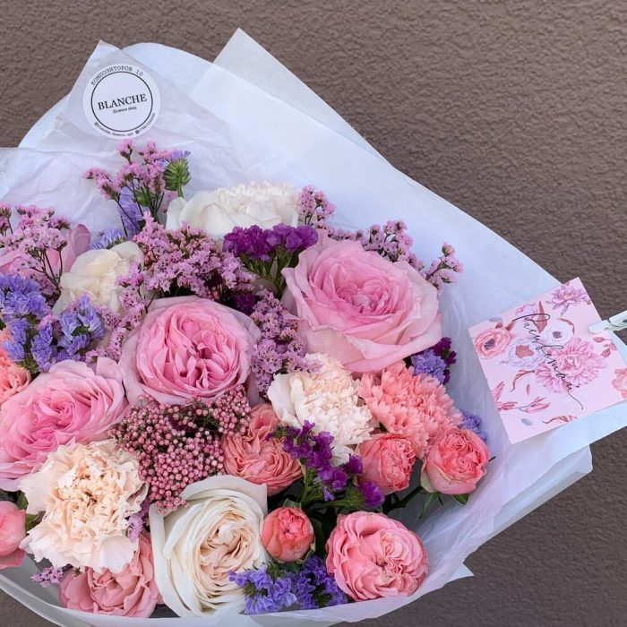 Pink O’Hara роза – 4 шт.white o’hara – 3 шт.кустовая роза madam bombastic – 2 шт.диантусы сортовые – 5 шт.Озотамнус розовый – 2 шт.Лимониум – 9 шт.Фирменная упаковка – 1 шт.
