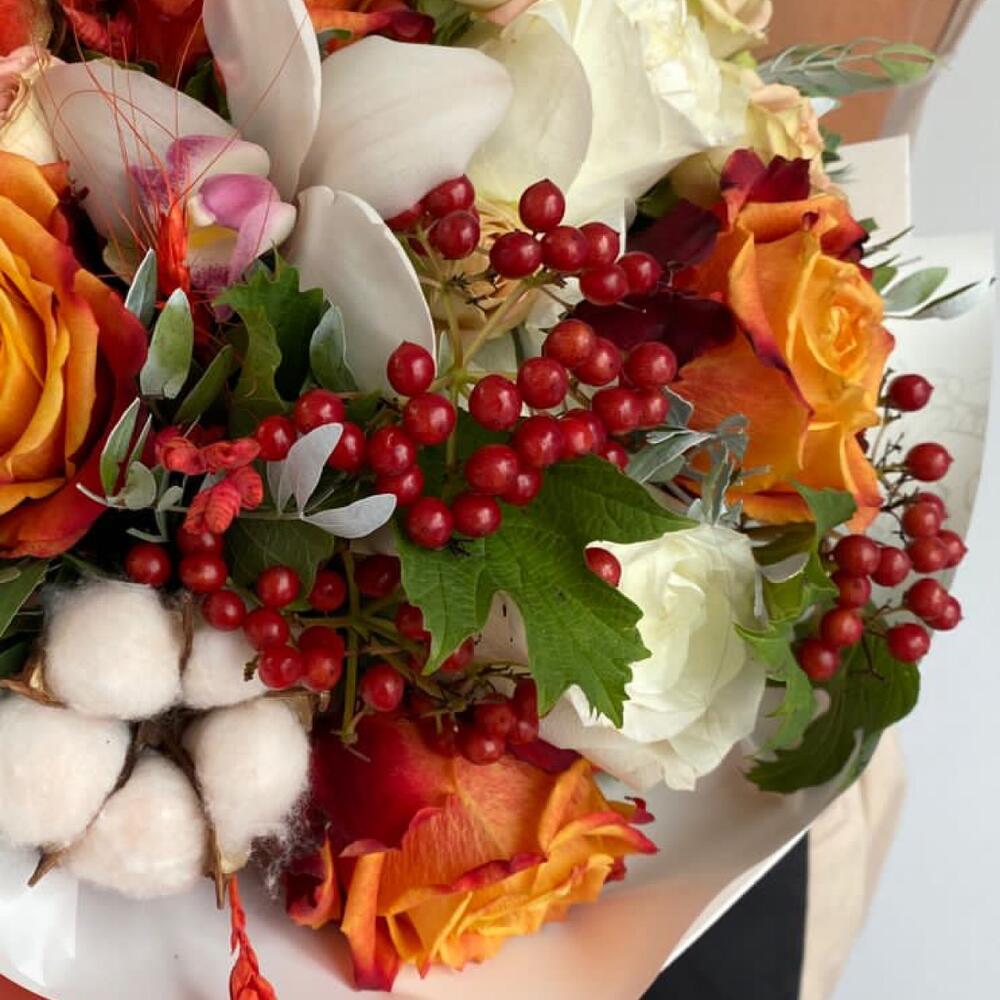 Роза Эквадор – 6 шт.Кустовая роза – 3 шт.Орхидея Цимбидиум – 1 шт.Калла – 1 шт.Хлопок – 2 шт.Сухоцветы – 3 шт.Фисташка – 3 шт.Салал – 3 шт.Пленка матовая – 6 шт.бант атласный – 2 шт.