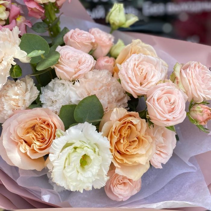 Лента атласная – 1 шт.Кустовая роза Бомбастик – 2 шт.Упаковка дизайнерская – 4 шт.Эвкалипт Микс – 3 шт.Роза шиммер – 3 шт.Диантус сортовой – 3 шт.антиринум – 2 шт.эустома алиса белая – 1 шт.