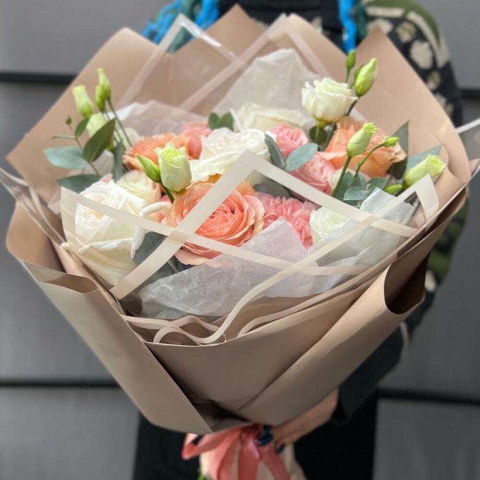 роза пионовидная вайт o’hara – 3 шт.Роза пионовидная кахала – 3 шт.Мадам бомбастик – 2 шт.Диантус одноголовый – 3 шт.эустома розита вайт – 2 шт.Эвкалипт – 3 шт.Пленка матовая – 5 шт.Тишью – 1 шт.Лента атласная – 2 шт.