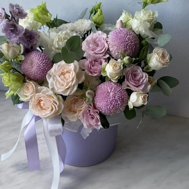Дельфиниум – 1 шт.Эустома белая махровая – 1 шт.роза кустовая инносенсиа пинк – 1 шт.роза кустовая пионовидная софия – 1 шт.сантини байкал – 2 шт.Хризантема момоко – 3 шт.Диантус белый – 2 шт.Эвкалипт – 2 шт.Коробка шляпная – 1 шт.Тишью белое – 1 шт.Лента атласная – 2 шт.