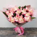 Букет 15 розовых роз и 20 белых альстромерий
