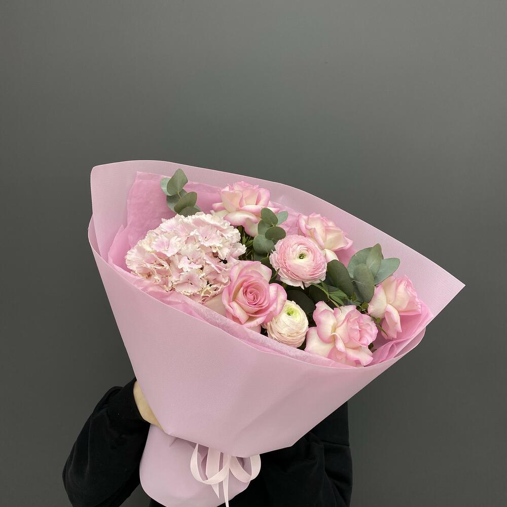 Альстромерии, Гортензии, Кустовые розы, Лизиантусы, Розы, Хризантемы