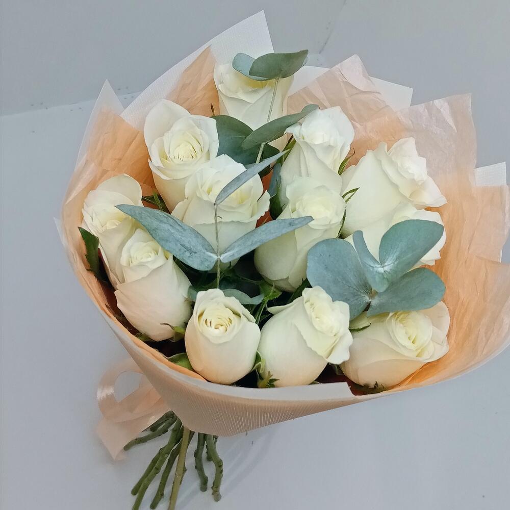 Букет из 13 роз белых с эвкалиптом
