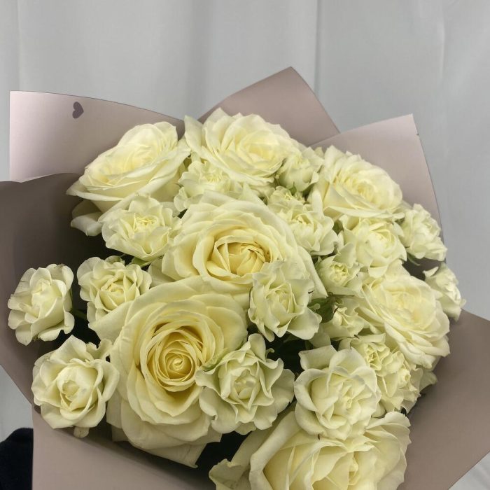 Объемный букет из кустовых пионовидных и одноголовых роз