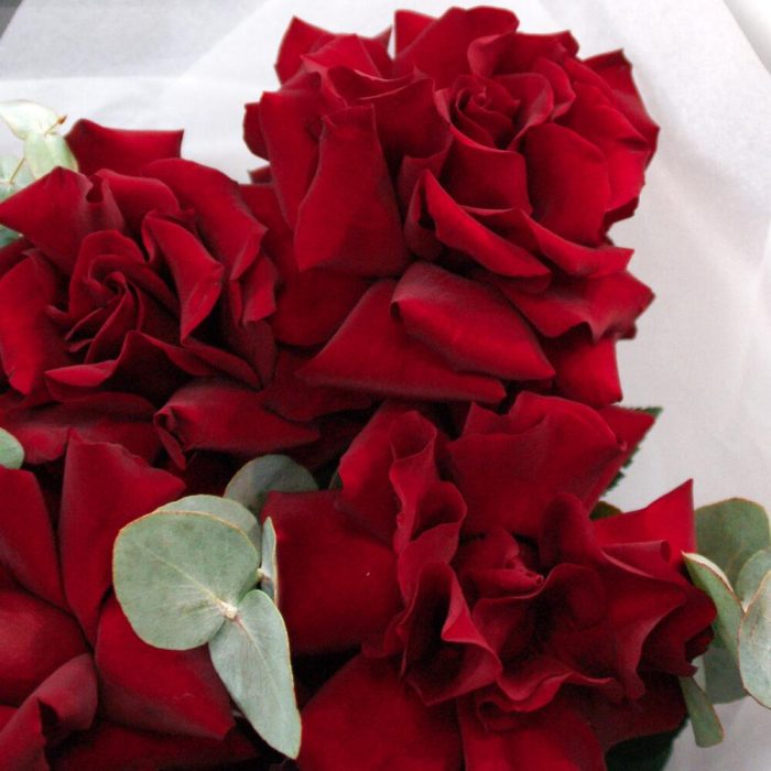 Эвкалипт – 2 шт.Тишью – 2 шт.Атласная лента – 2 шт.Французская роза – 7 шт.Матовая пленка – 2 шт.