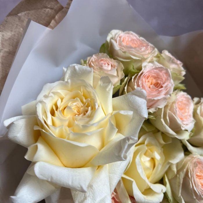 роза кендллайт – 3 шт.Кустовая роза – 2 шт.диантусы – 3 шт.Хлопок – 2 шт.декоративная упаковка – 1 шт.Атласная лента – 1 шт.
