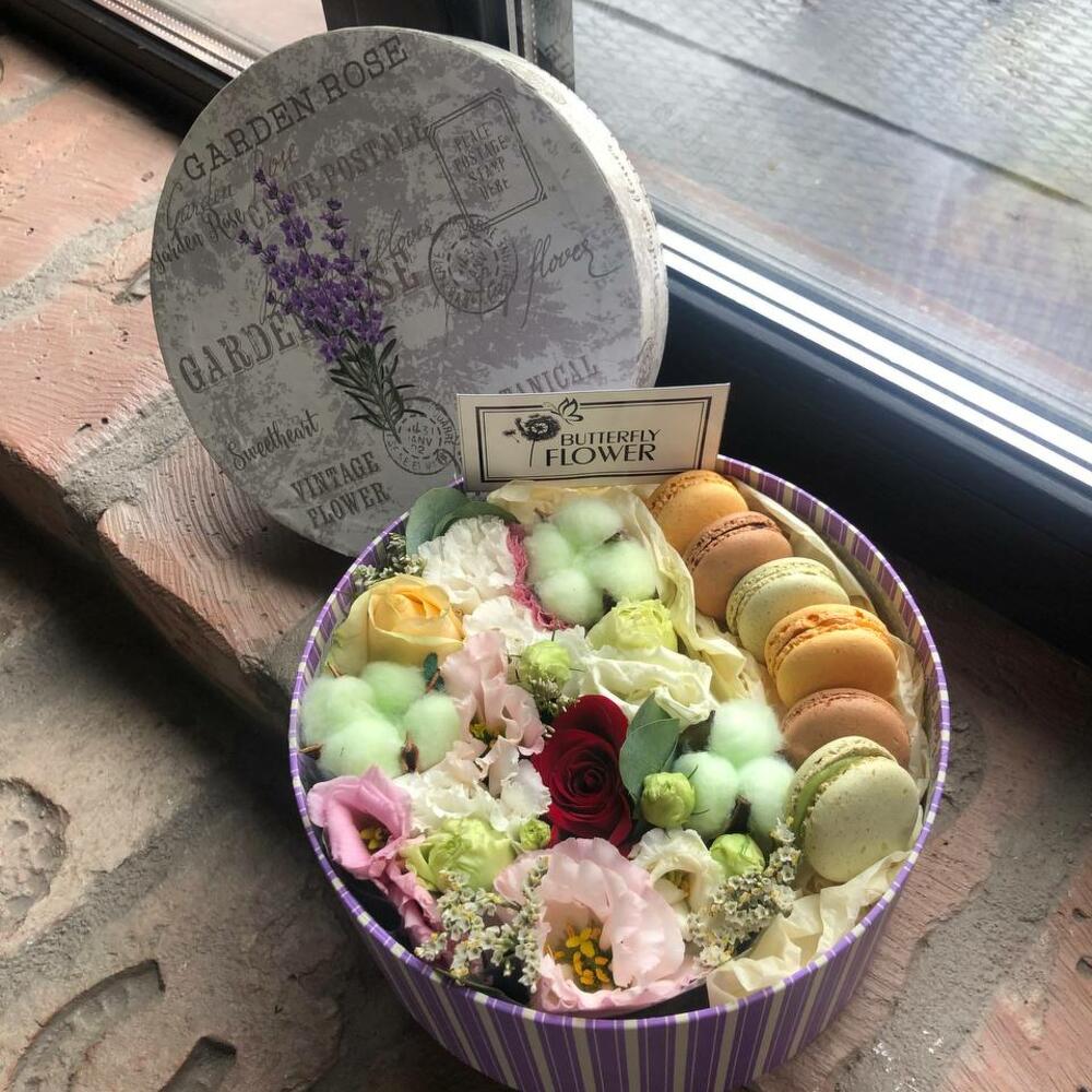 Роза кустовая – 4 шт.Хлопок – 3 шт.Эустома – 1 шт.Шляпная коробка – 1 шт.Макарон – 6 шт.декоративная зелень – 2 шт.