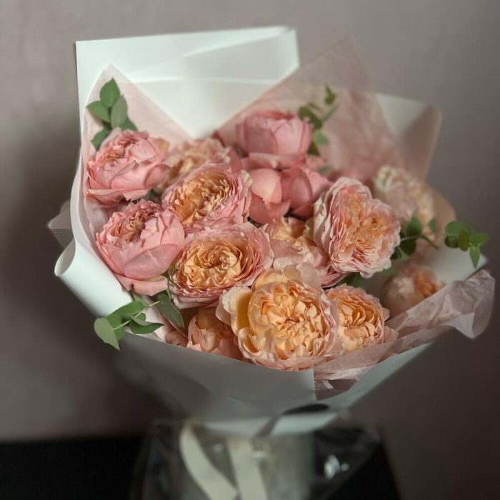 Букет из кустовой пионовидной розой и эвкалипт