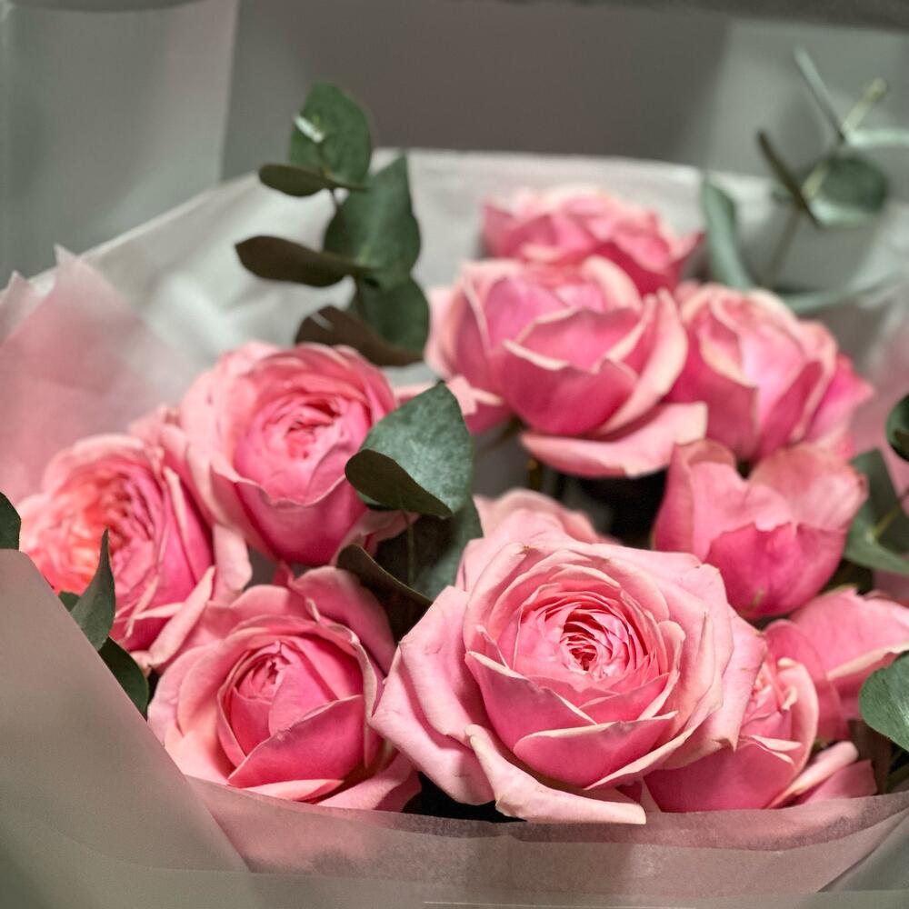 Букет из кустовых пионовидных роз Джульетта садовых пионовидных роз и эвкалипта