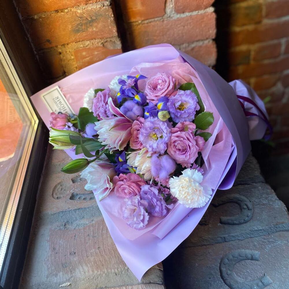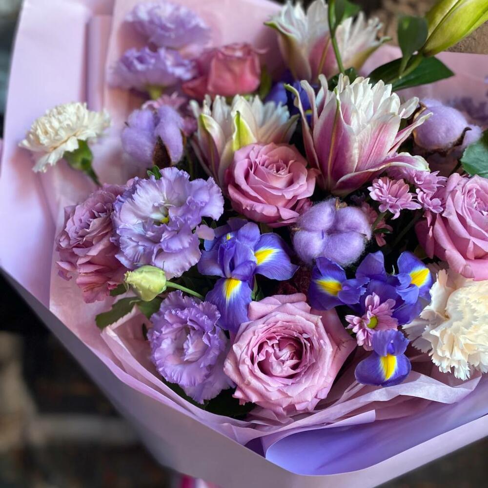 Букет из лилии, хлопка, эустомы, роз, диантусов, ирисов, кустовой хризантемы и самшита в стильной упаковке “Джун Осборн”