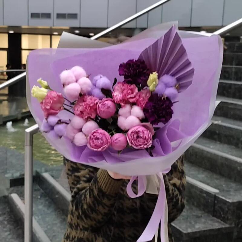 Лизиантус – 1 шт.Хлопок – 6 шт.Диантус – 2 шт.Роза кустовая пионовидная – 1 шт.Пальма – 1 шт.Лента – 2 шт.Упаковка дизайнерская – 2 шт.