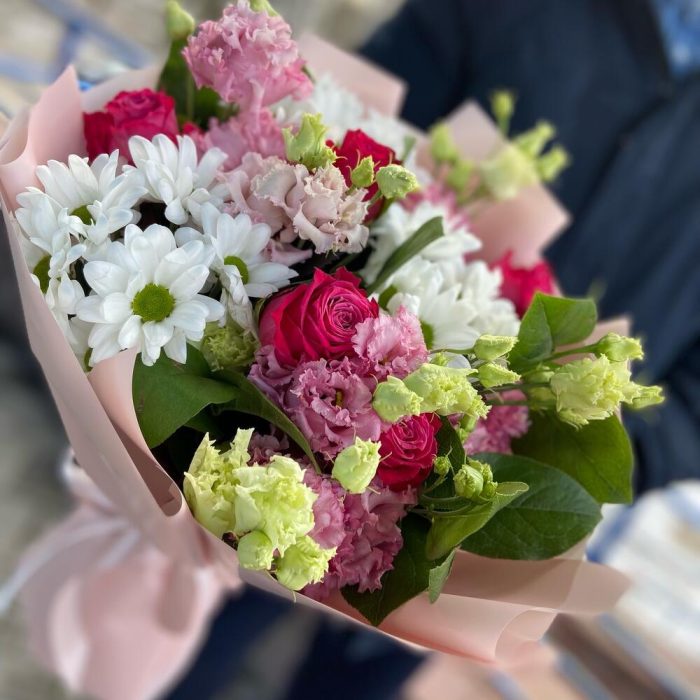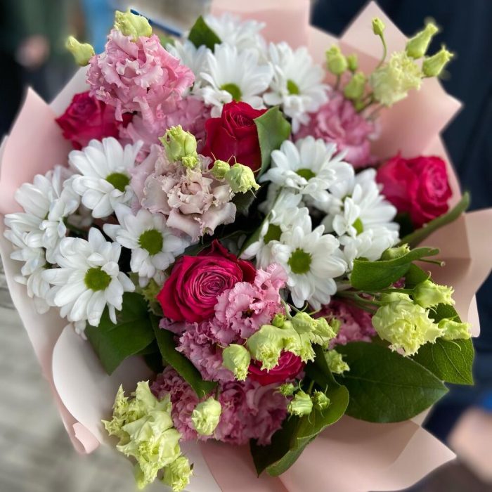 Роза – 5 шт. Эустома – 5 шт. Хризантема кустовая – 3 шт. Салал – 5 шт. Упаковка дизайнерская – 1 шт.