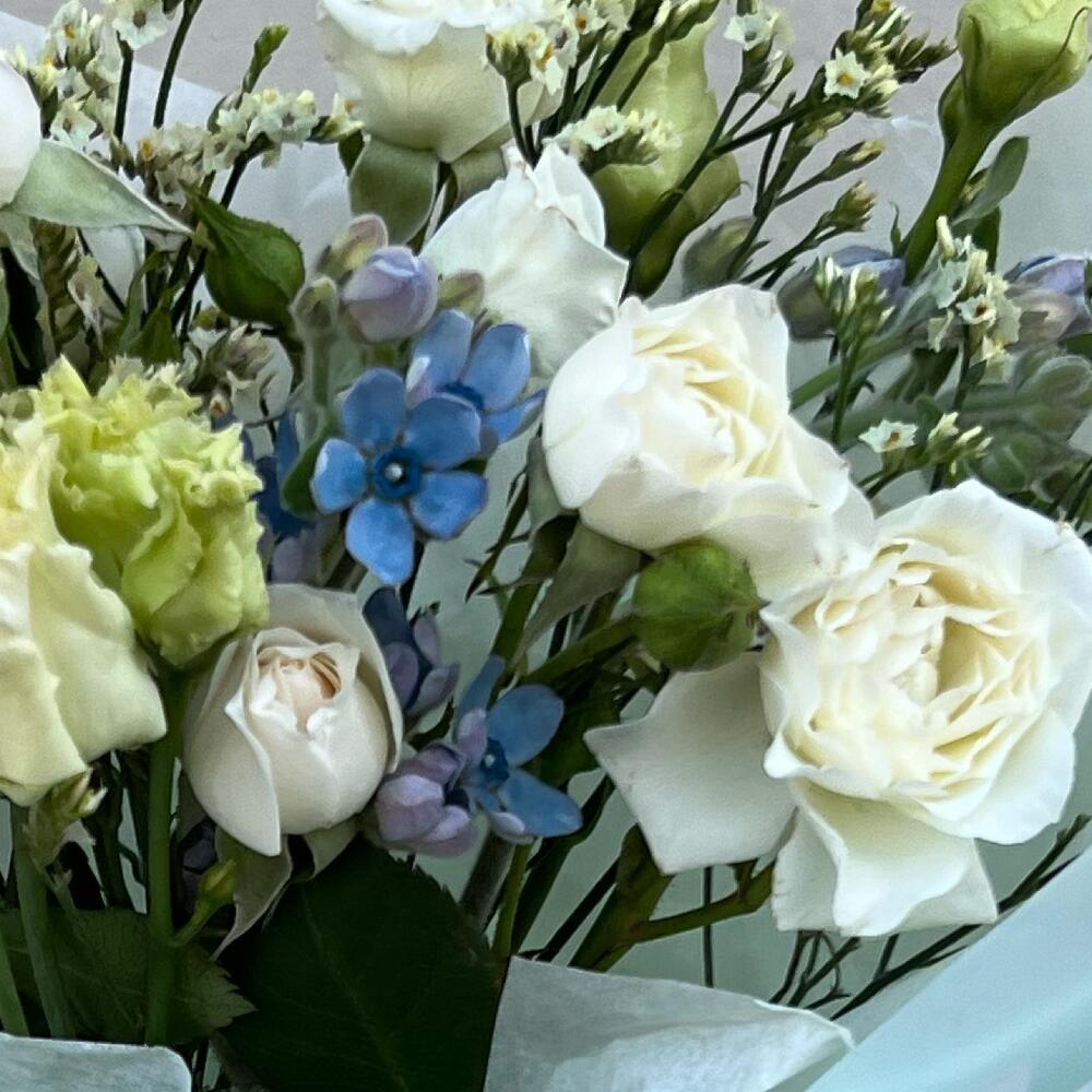оксипеталум голубой – 2 шт.Роза кустовая белая – 2 шт.